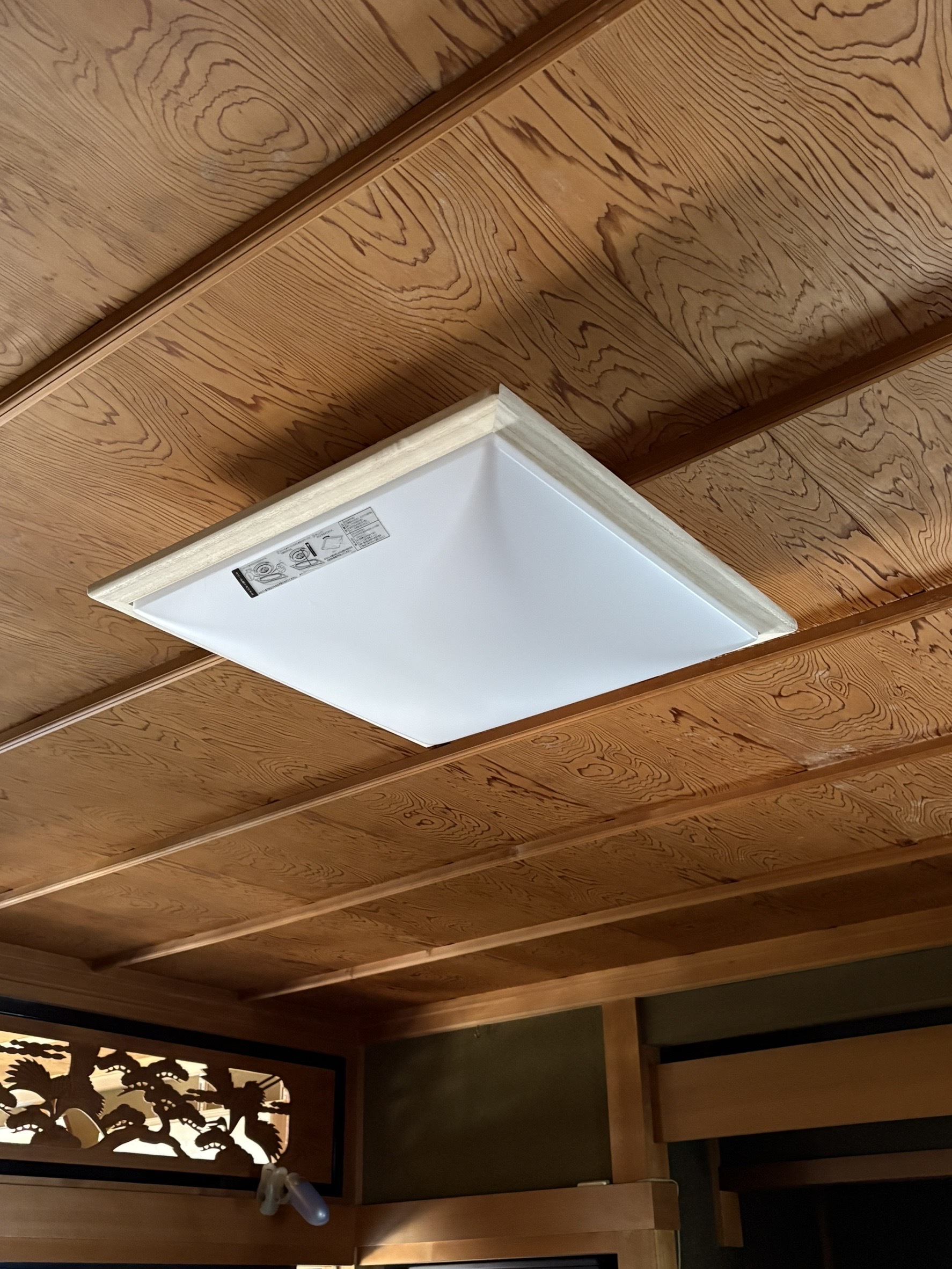 お得意様宅の和室天井LEDの木枠で落ち着いた和風LED照明器具を取付けさせていただきました。和室の仏間もあり、来客用の応接間もあるお客様宅まとめて12台お買い上げいただきました。電気 水道 ガス 住宅設備 リフォーム 新築お家まるごとおまかせください!